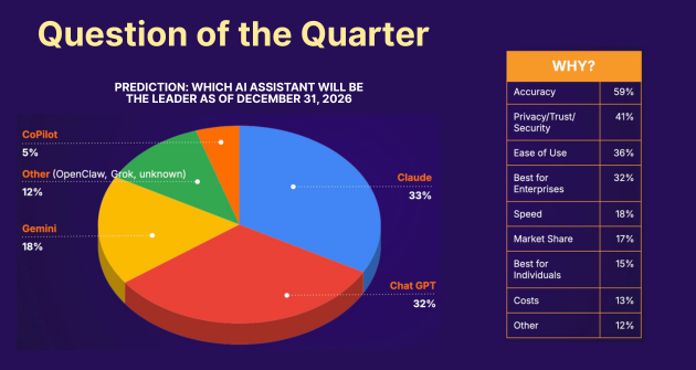 - Looking ahead, the competitive landscape for AI assistants is still unsettled. Leaders are split between Claude (33%) and ChatGPT (32%) as likely market leaders by the end of 2026, with smaller shares for Gemini and others. Selection criteria are pragmatic: accuracy leads by a wide margin, followed by trust and security, ease of use, and enterprise readiness, indicating that performance and reliability, not hype or cost, will determine long-term winners.