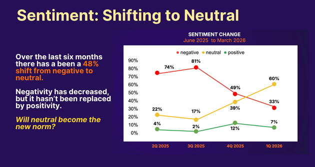 - CEO sentiment is stabilizing, with 40%+ shifting from negative to neutral over the past three months. This reflects reduced downside risk - not a rebound in confidence.