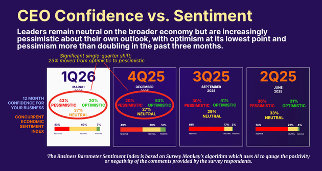 This Q1 2026 Business Barometer includes insights from the members of the following leadership organizations: Alliance of Chief Executives, Athena Alliance, BenchBoard CEO-CFO Coaching (Jim Cook), Board Harbor Foundation, CEO Roundtable (Minneapolis), Directors Academy, Global Data Innovation, The Institute for Entrepreneurship (Atlanta), LXCouncil and Quade.