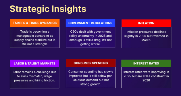 - External conditions are stabilizing but remain net constraints. Trade, regulation, and interest rates are no longer worsening, and access to capital is improving, but none have shifted into clear tailwinds.