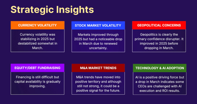 - Confidence is anchored to geopolitics, which remains the primary disruptor of sentiment and market stability. At the same time, there are early but uneven signals of upside: M&A activity has turned modestly positive and capital availability is improving. AI continues to be a strategic priority, though declining confidence points to growing scrutiny around execution and ROI.