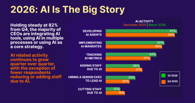 - AI remains a central strategic priority, with adoption holding steady at 82% of CEOs using it across multiple processes or as a core part of their strategy. Activity continues to expand quarter over quarter, signaling sustained momentum, though fewer organizations are making workforce changes tied directly to AI, suggesting a shift from experimentation to integration rather than disruption