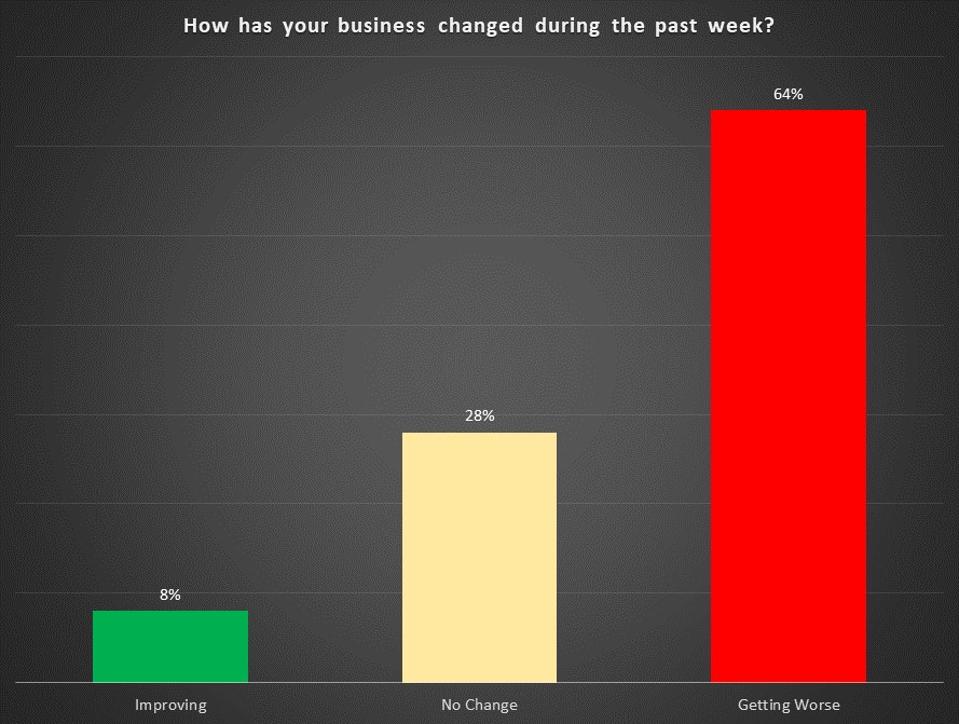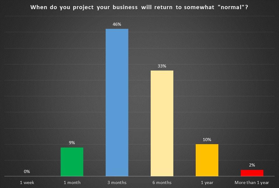In a flash survey of San Francisco Bay Area CEOs taken on March 19, 2020 just a few days after the USA’s first shelter-in-place order, 75% of the CEOs report negative impacts while 9% are being positively impacted. Collectively, they believe it will be 4.9 months before we return to “normalcy.”